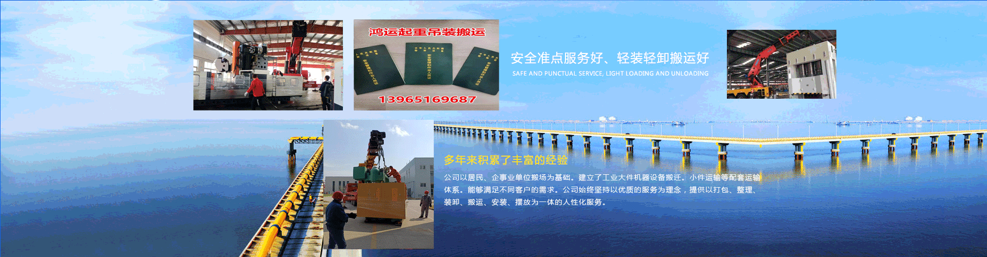 本公司從事專(zhuān)業(yè)機(jī)械設(shè)備維修安裝:承接大件起重設(shè)備搬運(yùn)安裝工程。吊裝移位、大型機(jī)床、注塑機(jī)、冷水機(jī)組、發(fā)電機(jī)、醫(yī)療設(shè)備、印刷機(jī)、空調(diào)機(jī)組、鍋爐等安裝調(diào)試。油壓機(jī)、離心機(jī)組。橋梁架設(shè)、機(jī)場(chǎng)、港口、鐵路、機(jī)械設(shè)備搬運(yùn)等。承接市區(qū)及省內(nèi)外大笨重設(shè)備起重、運(yùn)輸就位??照{(diào)機(jī)組,電梯吊裝,物流運(yùn)輸?shù)?,廠(chǎng)房、單位、工廠(chǎng)、學(xué)校、工程搬家、保潔。